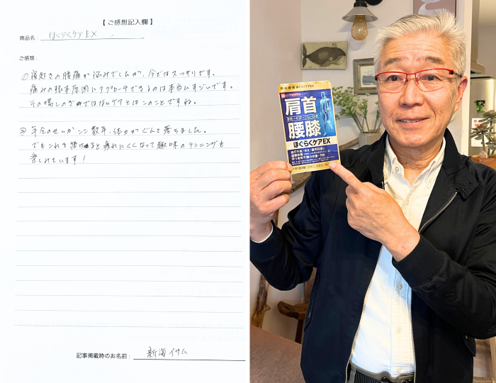 夫婦そろって腰の痛みに長年悩まされていました。特に朝起きたときや買い物から帰ったあとがつらく、出かけるのも億劫に…。娘にすすめられてこの商品を飲み始めてから“あれ?腰の重だるさが軽い”と感じる日が増えました。今では週に2回夫婦で散歩を楽しんでいます。本当にありがたいです。
